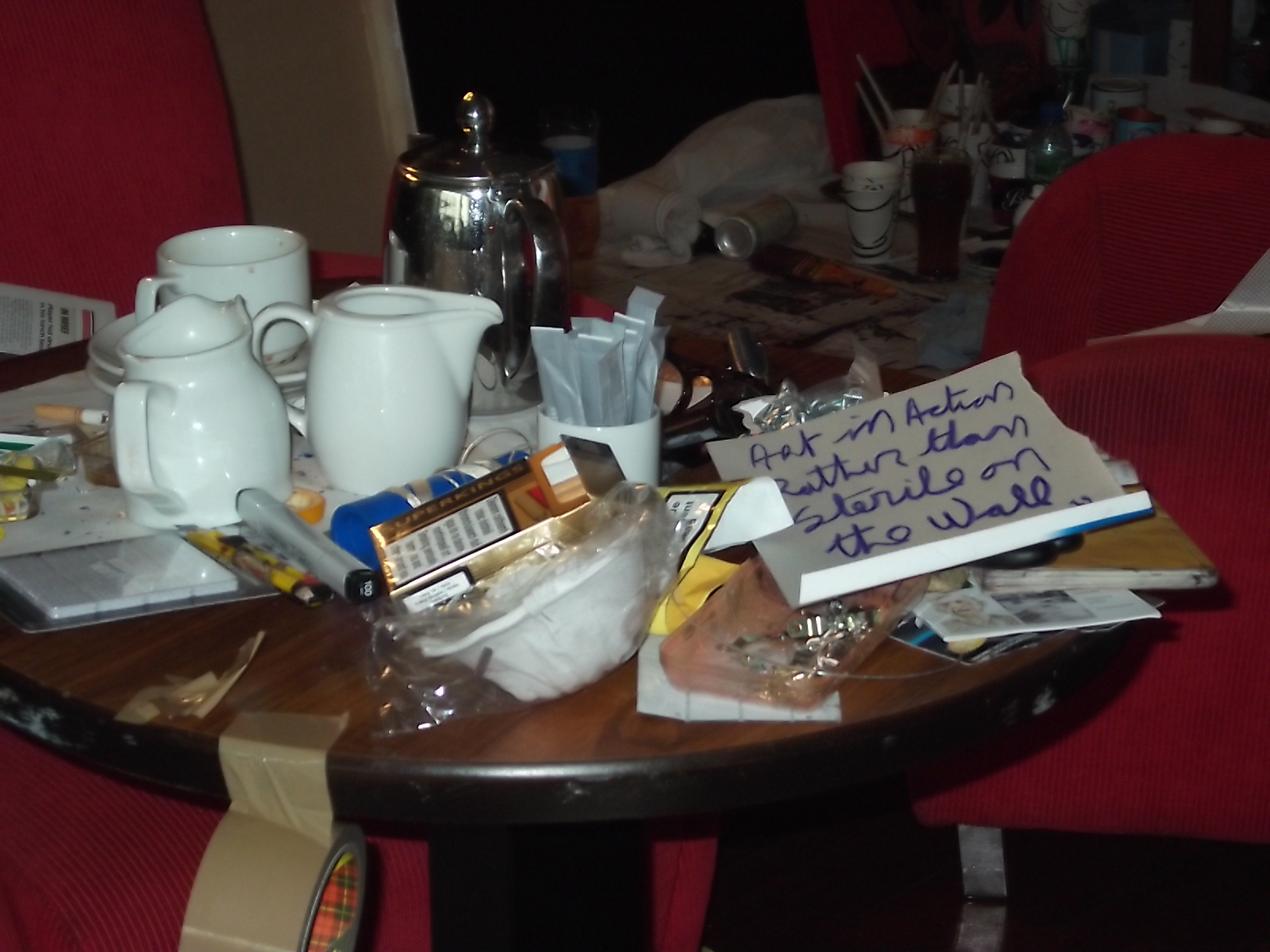| Card reads 'Art in action rather than sterile on the Wall' on Mulcahy's stall |